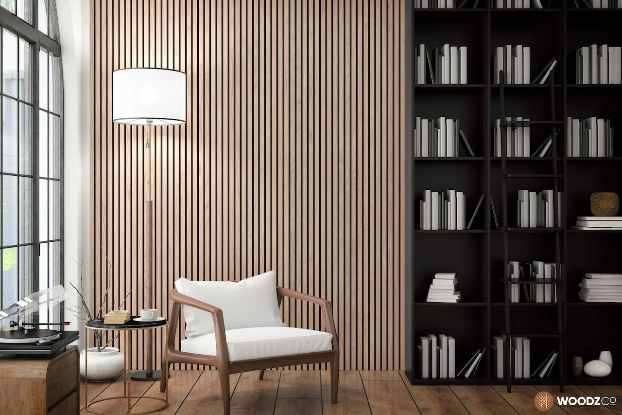 La collection ELEMENT de WoodzCo est un panneau de bois fait de lames de bois massif assemblées à des lames de soutien en bois naturel qui permet d’intégrer facilement des lattes de bois sur un mur ou un plafond intérieur.